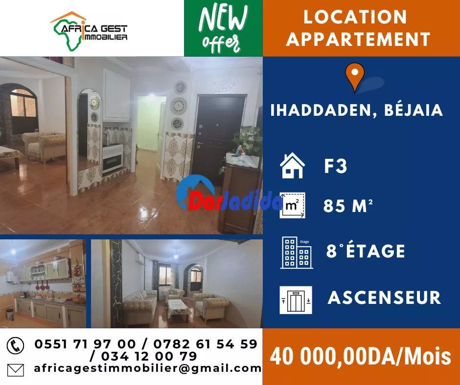 L’agence Africa Gest Immobilier vous propose en location un bel appartement vide de type F3, d’une superficie de 85 m², situé au 8ᵉ étage avec ascenseur sis à Ihaddaden – Béjaïa, à proximité de l’Hôtel Royal et de plusieurs commodités.