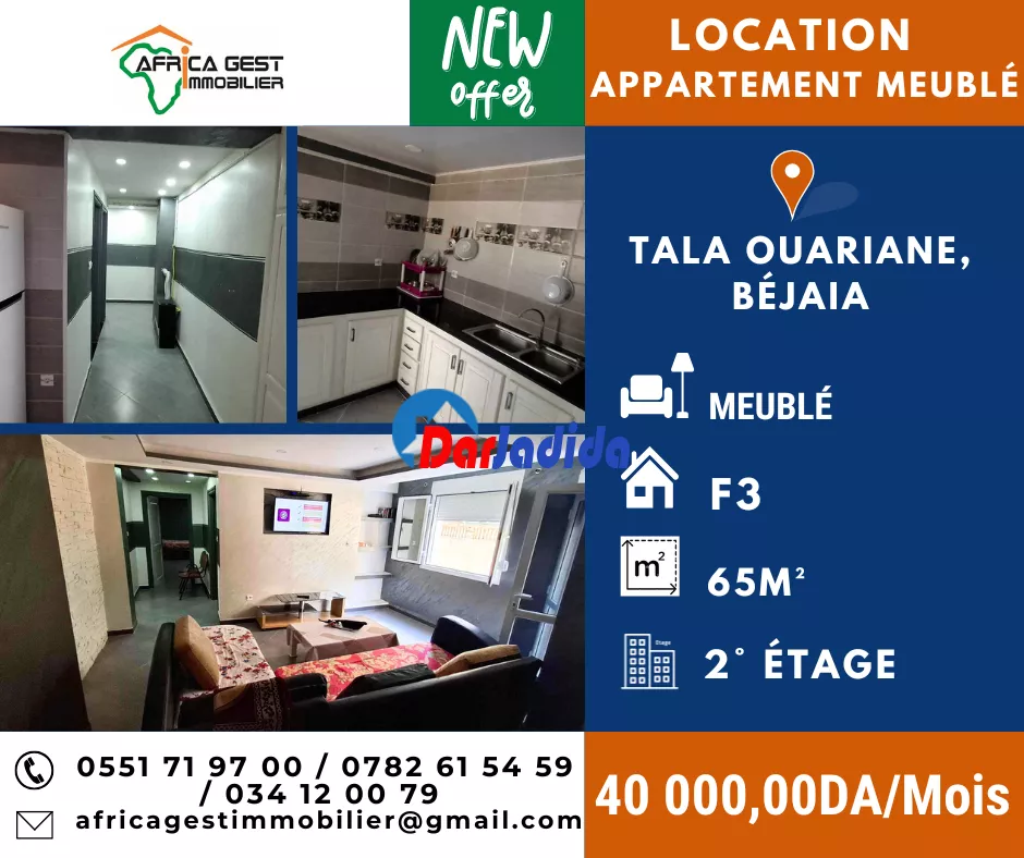 L’agence immobilière Africa Gest vous propose à la location longue durée un bel appartement meublé sis à Tala Ouariane, Béjaïa.