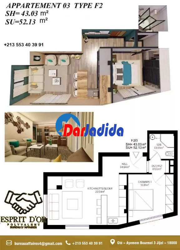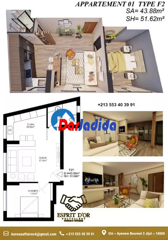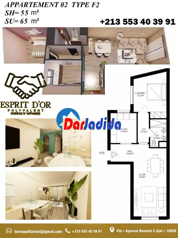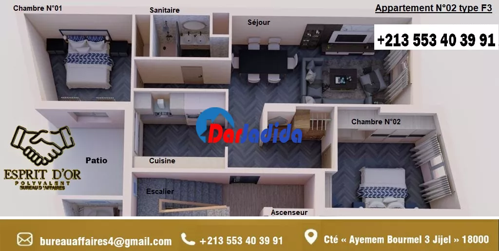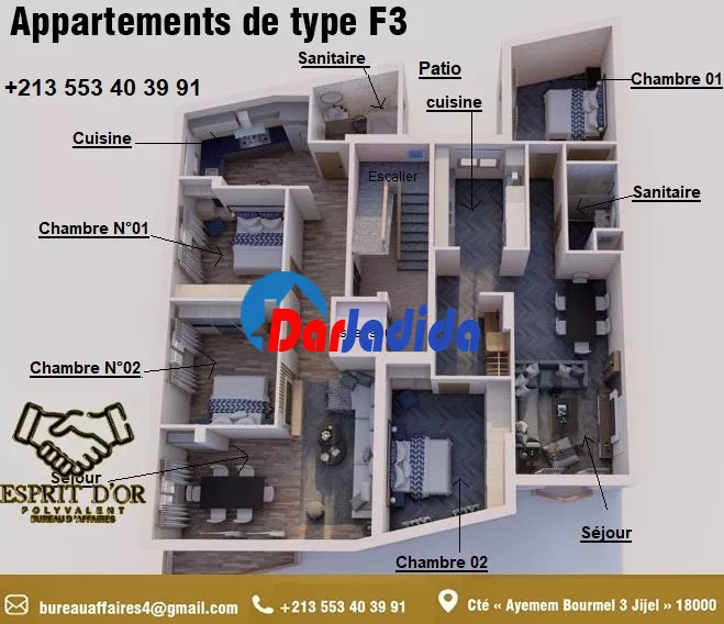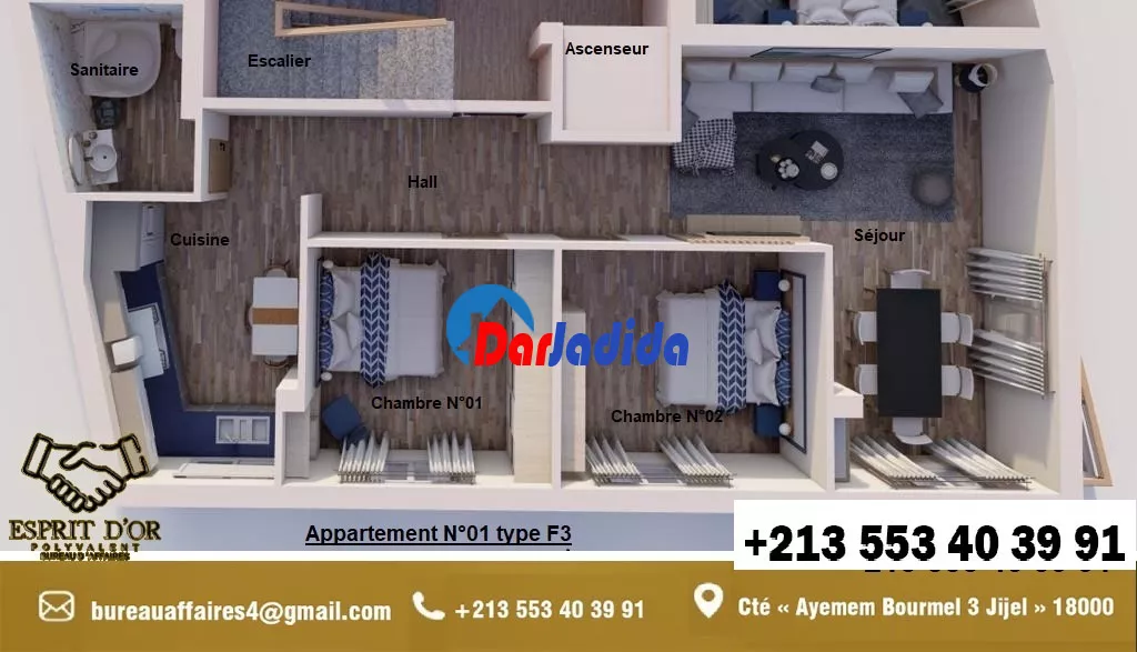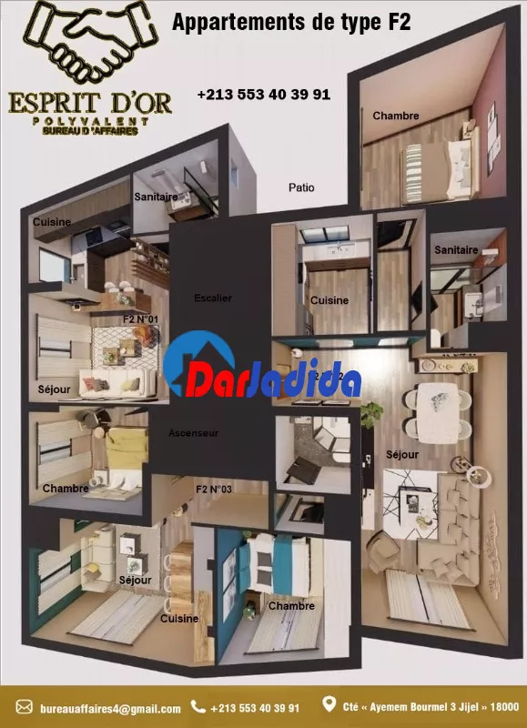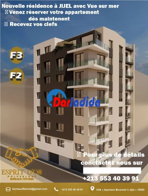 Notre bureau d'affaire Esprit d'Or Polyvalent vous propose Un nouveau projet en fin de construction, situé à la cité « Ayemem Bourmel 3 Jijel » – entrée Ouest de la Ville – route des plages, dans un quartier, résidentiel paisible dans son implantation lui confère une position stratégique à proximité de toutes les commodités de vie, écoles, commerces mosquée…etc :
